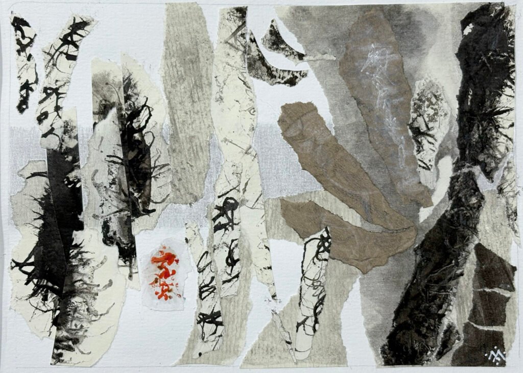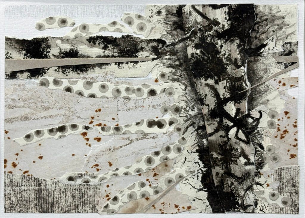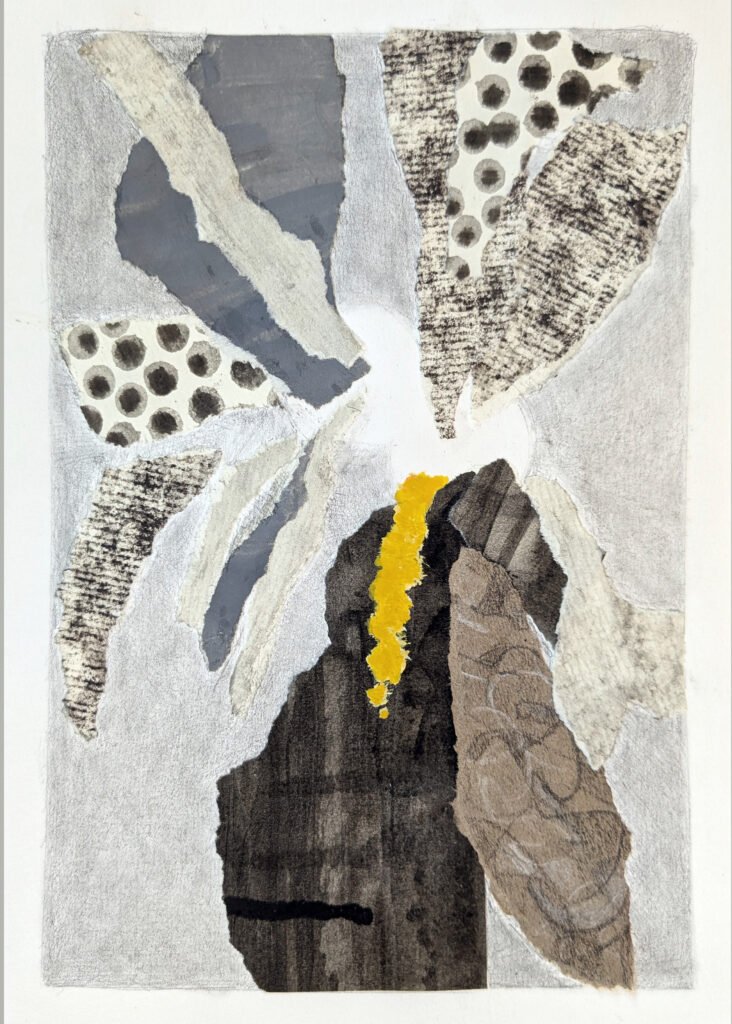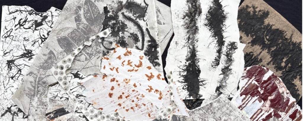 Tearing paper and gluing it down is intuitive work. It resists prior planning. It is a bit dreamy, yet it requires strong attentional focus—focus of a non-verbal, non-logical kind—to find and to follow some nameless thread of an idea, as it emerges. Failure to find and to follow such a thread quickly turns the collage incoherent; prematurely naming the thread turns it trite.