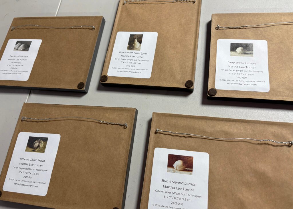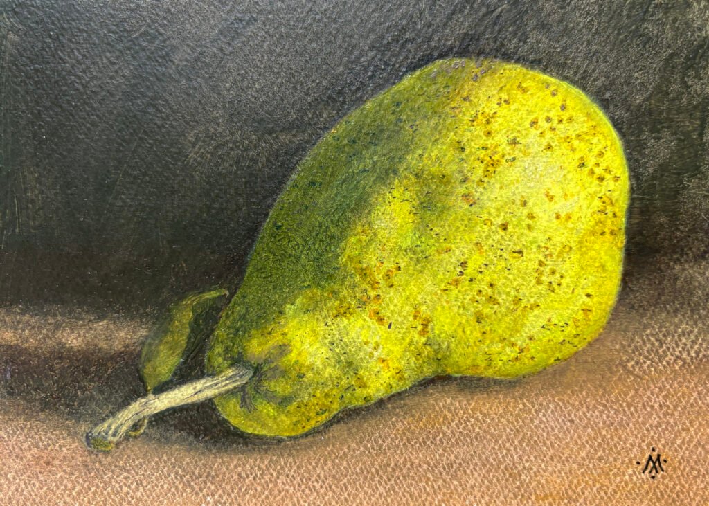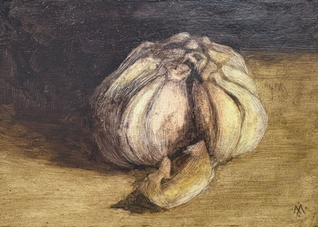 This series of “vegetable icons” depicts individual fruits and vegetables. The series was created in late 2024. These are small (5×7 inch) paintings in oil on paper, made using a subtractive technique. That technique, along with the interaction of the oil paint with the primed paper, create an unusual visual texture with a sense of illumination and mystery.