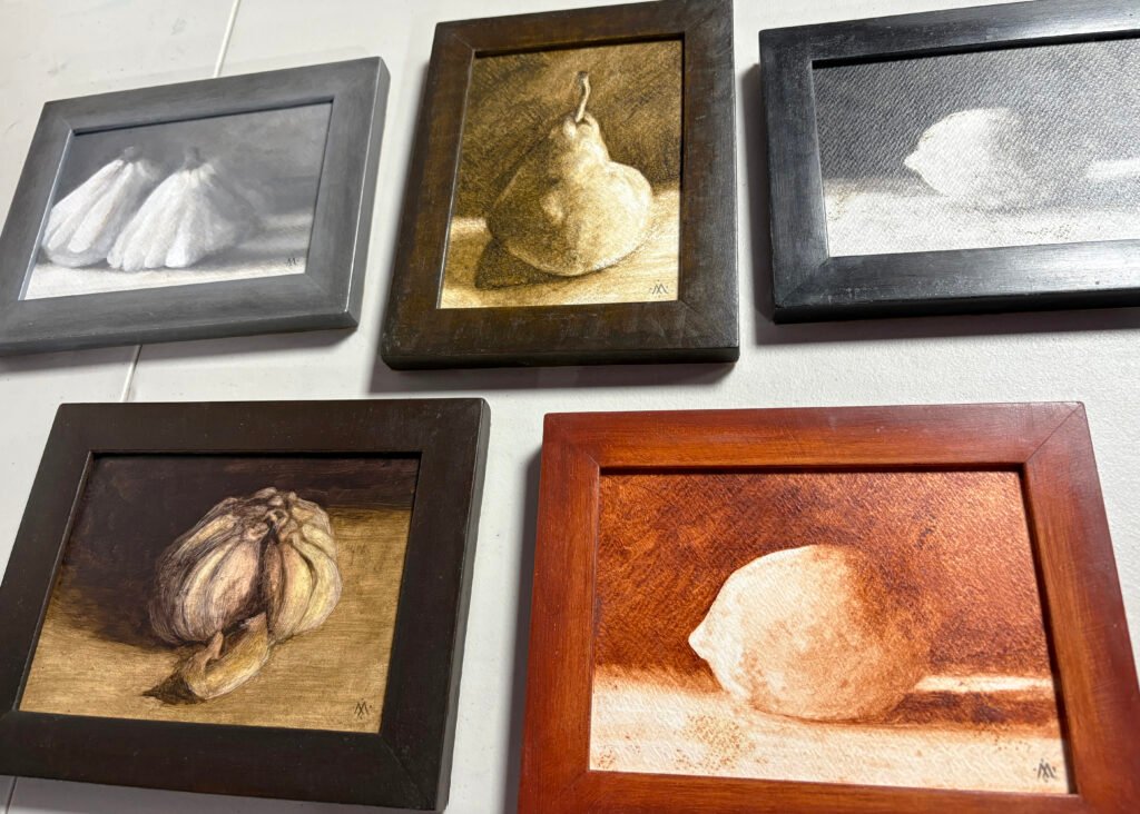My first series of “vegetable icons” is currently framed in hand-oil-painted frames, using the same pigments used for the image. The framed size is 6 3/4″ x 8 3/4″.