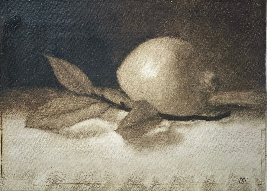 Sometimes I see a painting or drawing of a fruit or vegetable that seems, to me, somehow just a bit mysterious. Often it is a rather simple depiction, maybe of a single fruit. It might be in a window sill, with light coming in. Or not. Some of Bill Creevy’s pastel still lifes affect me like that. Juan Sánchez Cotán achieved a similar effect, in a totally different style. I wanted to do something with that sense of mystery. There was something there, something that I wanted to work with. But I didn’t know how. I didn’t want to copy the style of these works. But there was something there that I wanted to express, in my own way. Something that these works pointed to. After a while, I noticed that I had begun thinking of these works as “vegetable icons.”