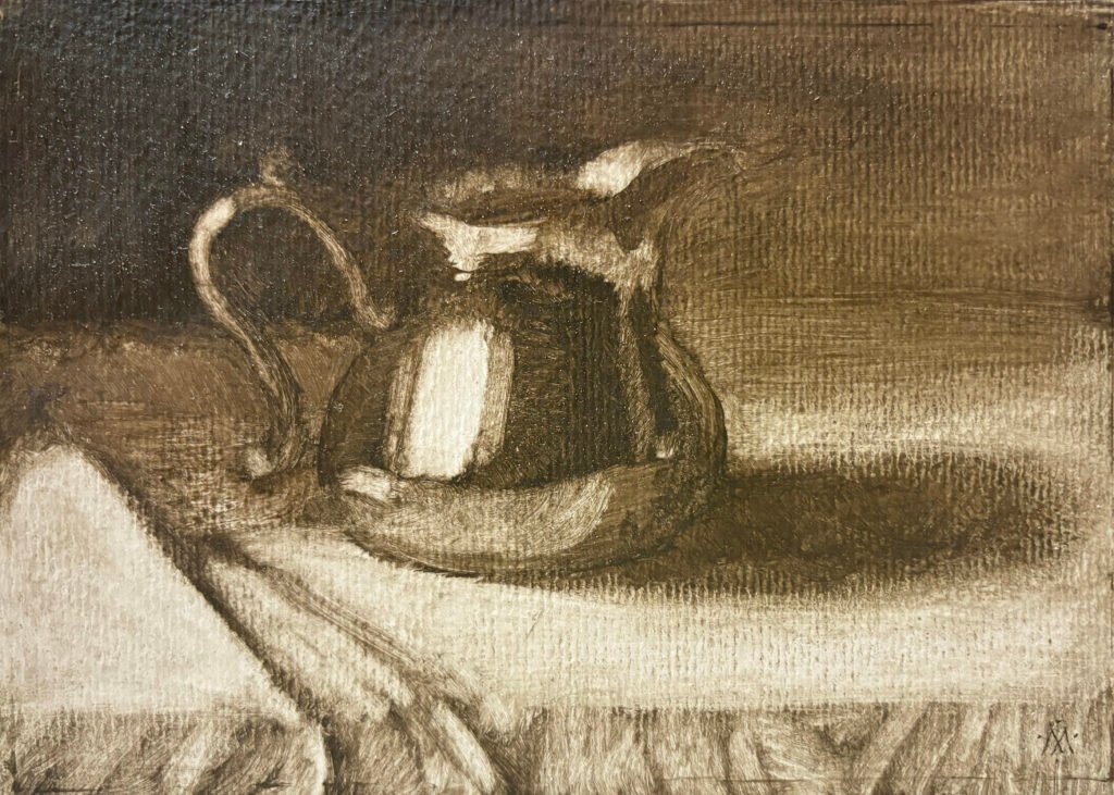 For more than a decade, I noticed this impulse, but did nothing with it. Then, working on other things, I began to experiment with wipe-outs. To make a wipe-out, you first cover your support with a solid layer of oil paint, usually a single, neutral color. Then, while it is still wet, you wipe the paint away to create highlights. You can use a rag, a brush, a cotton swab, your fingers—whatever suits. It’s an upside-down-and-backwards way to paint, that plays with your mind and provokes new insights.