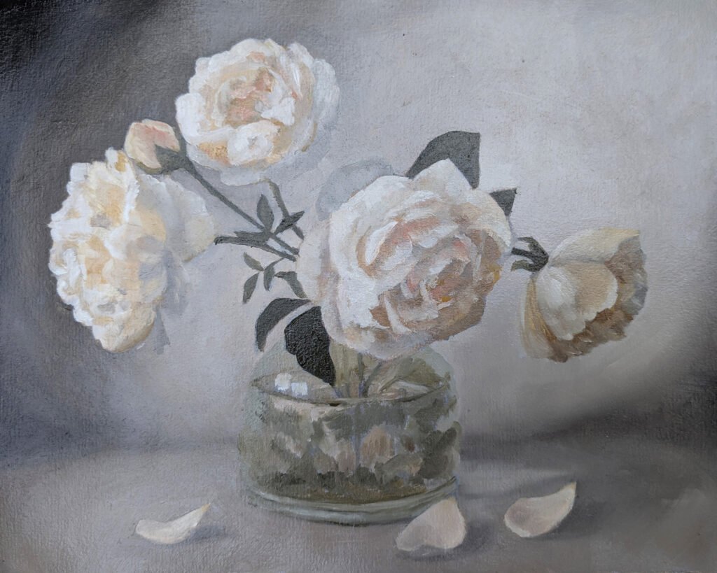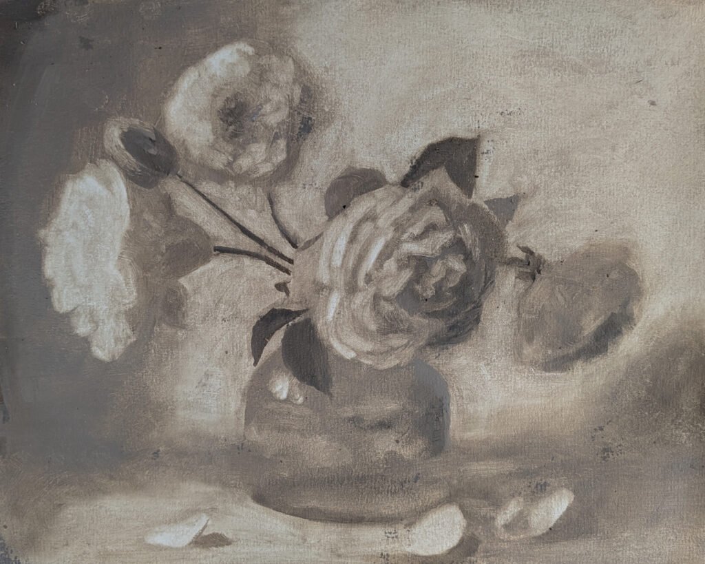 It’s also a very traditional way to establish the value structure of a painting, its pattern of lights and darks. Often, a mid-tone neutral is used for wipe-outs, establishing the pattern of values but not the full range of lights and darks. (Below, one of my own floral paintings: in the wipe-out stage and as a finished painting.)
